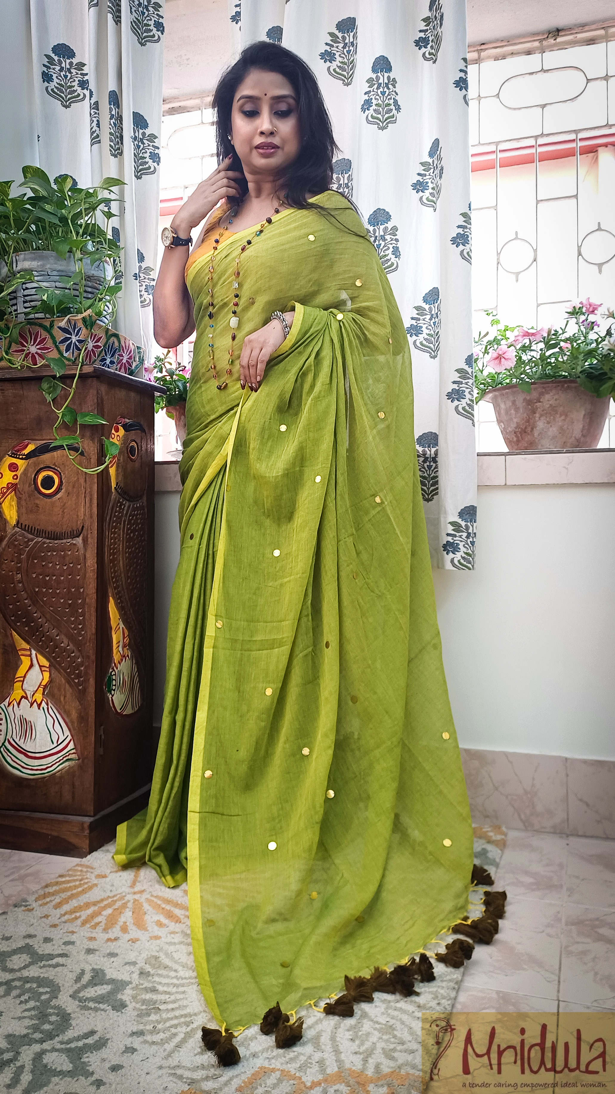 Mridula Komal Sitaare Peach Mul Cotton Saree with Sequin Work and Tassels